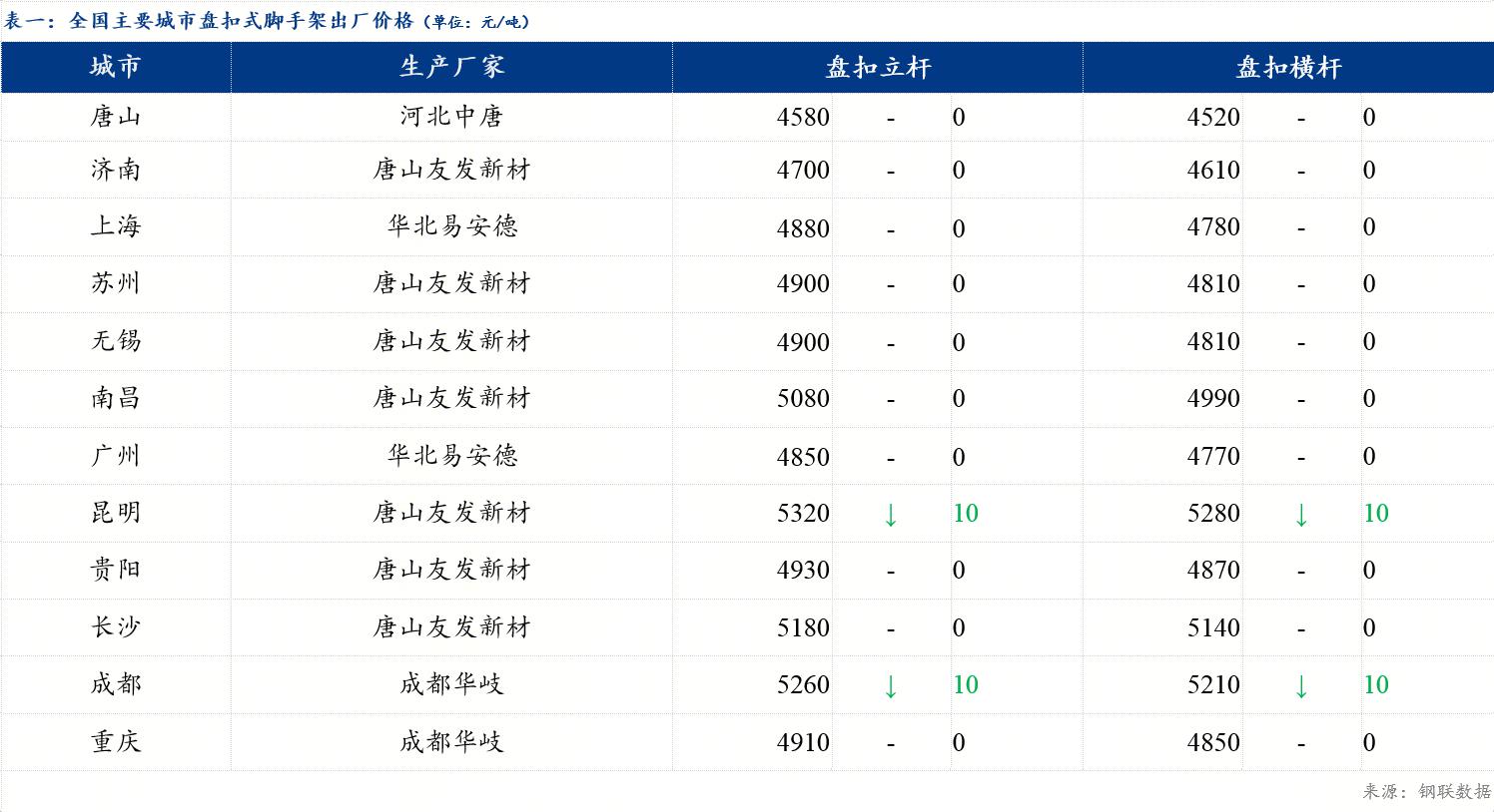 【南方地区】今日原材料端张家港板卷价格降10元/吨,盘扣市场价格弱势调整。南方盘扣市场交投氛围不佳,整体成交一般。上下游企业对后市持谨慎观望态度,囤货积极性一般,社会库存维持低位水平,下游及终端采购积极性一般。综合来看,预计明日南方地区盘扣式脚手架市场价格或将持稳运行。